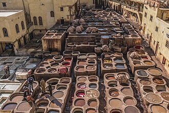 | Title | Tanneries. Large open-air vats of color dyes with tannery workers amongst them in Fez |