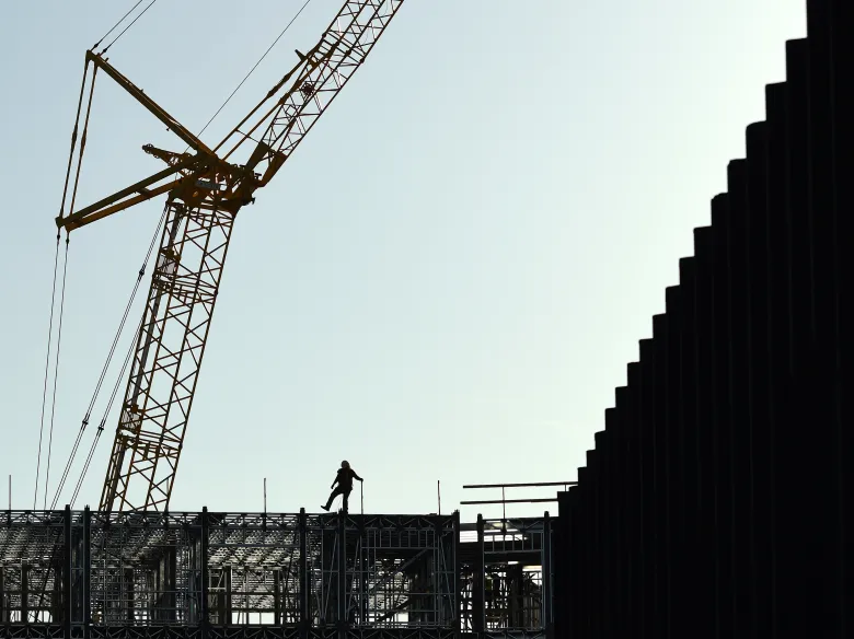 A construction worker stands on top of a new apartment complex being built in the RiNo neighborhood on March 5, 2020 in Denver.