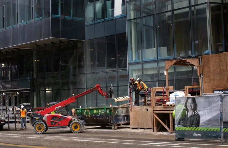 (Sellen Construction workers at an Amazon office building jobsite at 7th Ave and Blanchard St. in Seattle on Tuesday, before Gov. Jay Inslee’s order takes effect Wednesday evening.)