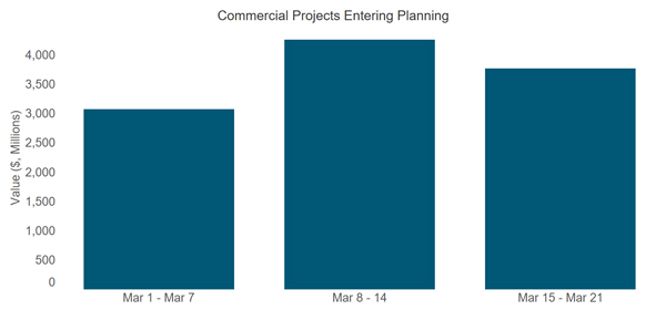 Initial planning projects in the commercial building sector have seemingly held up during the first week of major economic impact (Mar 15-Mar 21). A growing number of people are working remotely, so it seems plausible that remote access has provided private firms with greater flexibility. Heading into the crisis, the economy was also on solid footing with strong hiring and real estate fundamentals (such as vacancy rates and rents). This should insulate — at least in the short term — the commercial sector’s ability to initiate the planning process by entering projects into the construction pipeline. In fact, the dollar value of commercial projects entering planning during the first three weeks of March compared to the same period of February shows little to no difference. From a regional perspective, however, commercial planning in the Midwest and West appears to have pulled back, while activity in the South seemed particularly strong last week. Regional definitions are shown here: https://www2.census.gov/geo/pdfs/maps-data/maps/reference/us_regdiv.pdf).