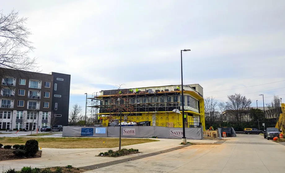 (Construction crews continue facade work Tuesday on an outbuilding component of development at the MARTA Candler Park-Edgewood Station, a multifaceted conversion of parking lots.)