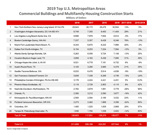 The value of commercial and multifamily construction starts in the top 20 metropolitan areas of the U.S. gained 11 percent in 2019, reaching $139.6 billion, according to Dodge Data & Analytics.