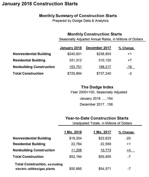 The 7% decline for total construction starts on an unadjusted basis for January 2018 relative to January 2017 was the result of a mixed performance by major sector. Nonbuilding construction increased 4%, with public works up 6% while electric utilities/gas plants dropped 6%. Nonresidential building fell 20% from a very strong January 2017 which included such unusually large construction starts as the $3.6 billion Central Terminal Building replacement project at LaGuardia Airport in New York NY, the $600 million McClellan Business Park data center in McClellan CA, and a $477 million terminal project at San Francisco International Airport. Compared to the same month a year ago, the institutional and commercial building segments of nonresidential building were down 23% and 21% respectively, while manufacturing plant starts advanced 18%. Residential building rose 1% from the same month a year ago, with single family housing up 3% while multifamily housing slipped 2%. By geography, total construction starts for January 2018 relative to January 2017 registered this pattern – the Northeast, down 36%; the West, down 10%; the South Central, down 9%; the South Atlantic, unchanged; and the Midwest, up 42%.